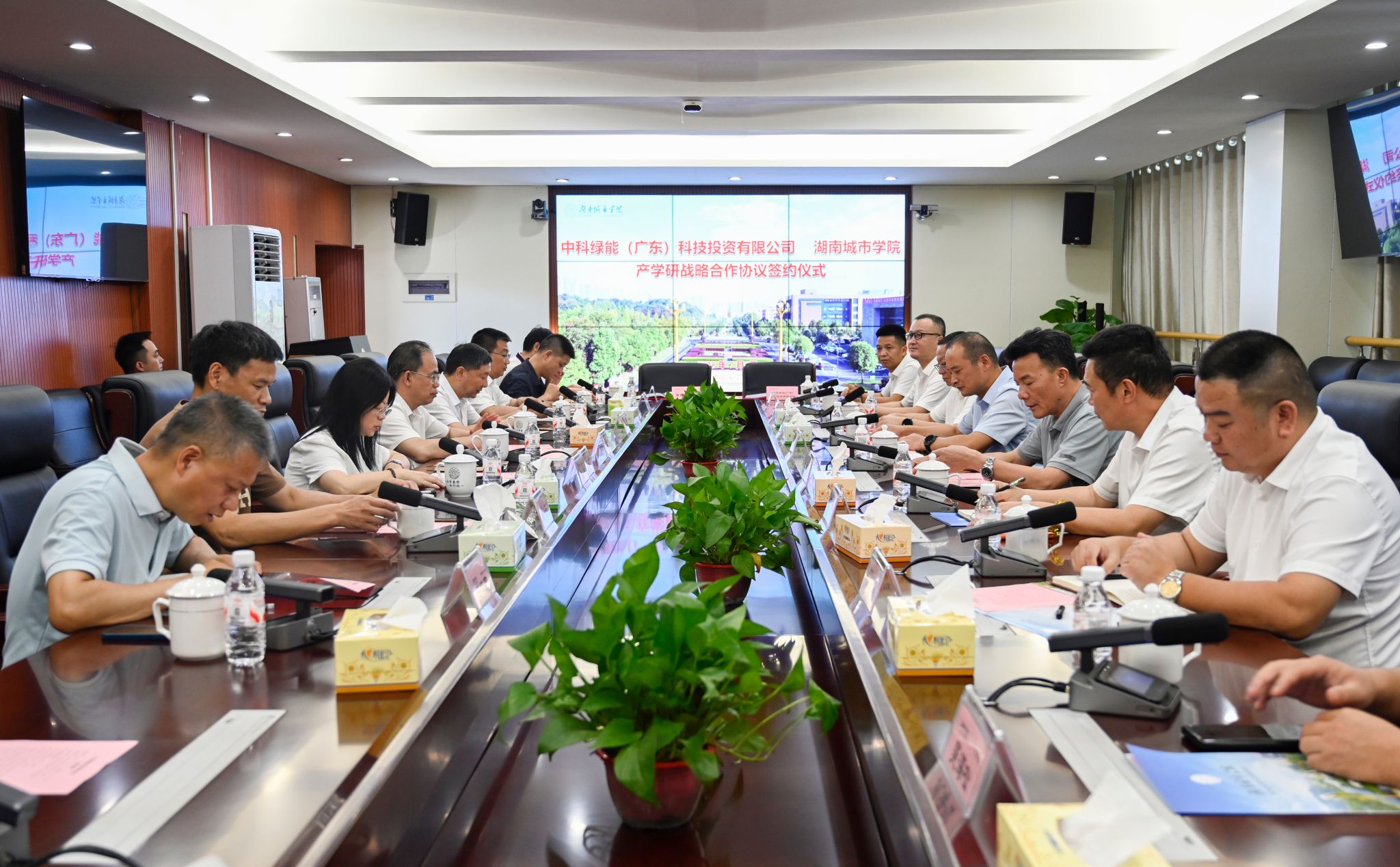 本网讯(通讯员 文强 陈玉娟)7月4日上午,学校与中科绿能(广东)科技投资有限公司产学研战略合作签约仪式在学校办公楼一会议室举行,双方聚焦新能源、智能机器人、数字科技等领域,深化校企协同,共育高素质应用型人才,共推科技创新与成果转化。校党委书记何振,中科绿能总经理张振德,副校长谭献良、徐姝,益阳市大通湖区区委书记王新宇,赫山区政协主席陈铁军出席仪式。仪式由徐姝主持。