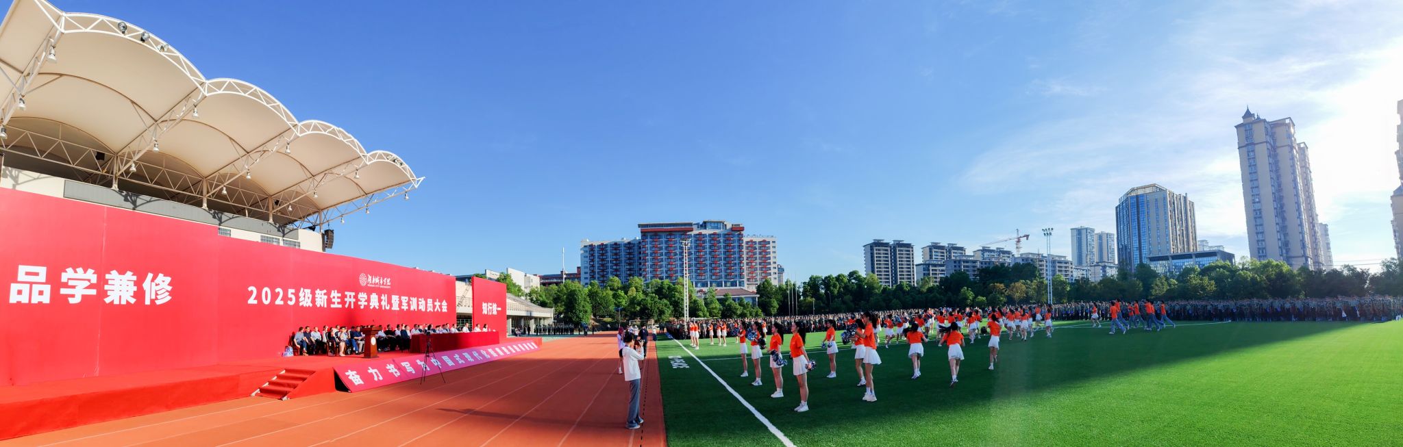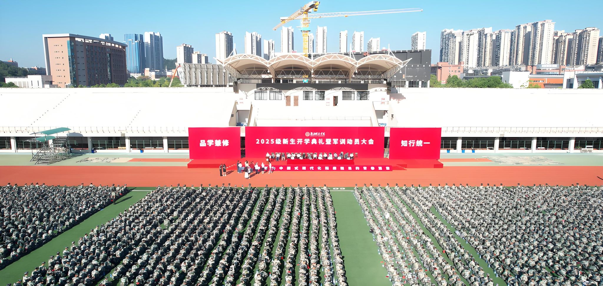 本网讯 苦尽甘来,十年寒窗终圆梦。乘风破浪,万里晴空任尔飞。9月17日上午,半岛web版登录入口_半岛online(中国)2025级新生开学典礼暨军训动员大会在学校东田径场举行,6600余名2025级本科生、研究生新生承载着殷切期望、怀揣着青春梦想,在城院开启人生新征程。校党委书记何振寄语2025级新生:要以“城”之名,砥砺报国,共织城市摇篮之美,充分认识、尊重、顺应城市发展规律,探索智慧城市建设新领域,在未来城市的画卷上留下青春注脚。