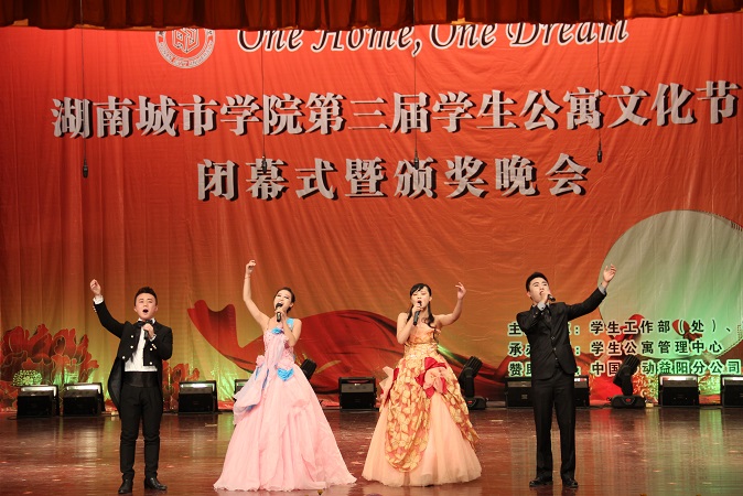 颁奖晚会在乐队演唱《在雨中》拉开帷幕,动感十足、高昂雄浑的声音展现了青年学生的热情与活力;歌曲《天下一家》奔放豪迈,充分凸显了城院师生相亲相爱一家人的和谐之美;由教师代表孙娜钢琴伴奏、孙波老师演唱的《月之故乡》将晚会推向了最高潮。