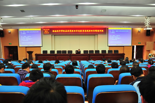 专题培训时间足额2天,安排了5堂专题报告和1部专题教育片。其中,中山大学原党委书记、国家教育咨询委员会委员李延保教授结合高校教育实践活动作了《高校内涵式发展》的专题辅导报告,他结合中管高校第一批教育实践活动的经验和成果,结合自身经验和对国内外高等教育的调查研究成果,就我国当前高等教育内涵发展中存在的共性问题、值得关注的几个全局性问题和战略布局作了鞭辟入里的分析;学校党委书记赵运林以《讲党性、重品行、作表率》为题做了专题培训,从“党性”、“品行”“表率”三方面详细解读了一名共产党员应有的可贵品质,在“为民、务实、清廉”上应起到的表率作用,同时对学校基层党组织书记提出了要求和希望;学校党委副书记、校长李建华做了《强化职业道德,建设和谐校园》的专题辅导,以职业道德的核心问题为切入点,讲授了职业道德的主要内容、建设途径,职业道德建设中的三个问题和和谐校园的构建;学校党委委员、副校长汤放华从《把握要求、整体推进,做师生员工的贴心人》入手,向师生们阐述了党的群众路线教育实践活动的要求、推进方法及学校的各项“贴心”举措;马克思主义学院副院长龚彬作了《把握新一届中央领导集体治国理政风格》专题报告。组织集中观看了中共中央党校郑权教授主讲的《保持党的先进性和纯洁性是群众路线教育实践活动的主线》教育专题片。