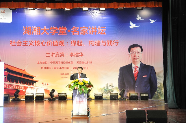 下午,由省委宣传部和省社科联主办的“湖湘大学堂·名家讲坛”在我校音乐厅隆重举行。长江学者、校长李建华教授主讲,他以“社会主义核心价值观的缘起、构建与实施战略为题,与省市社科界专家学者、新闻媒体和500余名师生代表畅谈交流。