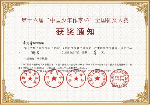 (本网讯)近日传来喜讯,中国小说学会、中国少年作家学会、中国少年作家班等单位联合举办的第十六届“中国少年作家杯”全国征文大赛评选揭晓,经过网络投稿、作品展示、评委会评审等阶段,我校美术与艺术设计学院李松泽同学的作品《碎花》荣获大赛二等奖,颁奖大会将于7月19日在人民大会堂举行。(张帅)