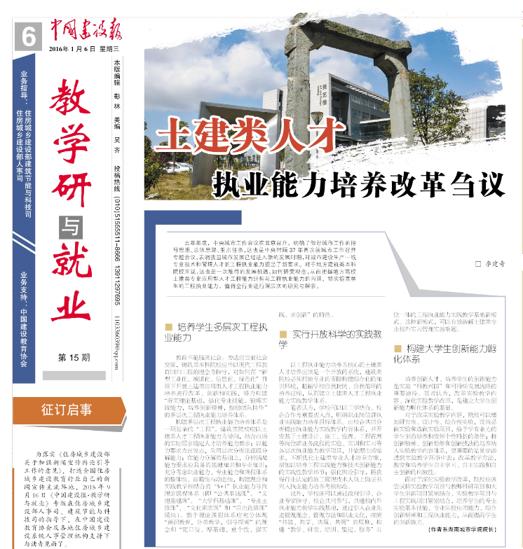 教授在《中国建设报》发表了题为“土建类人才执业能力培养改革刍议”的署名文章。文章结合中央城市工作会议精神,对建筑类高校培养学生多层次工程执业能力进行了解读。