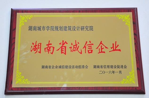 (本网讯)近日,湖南省企业诚信建设活动组委会公布了2015年度诚信企业评选结果,我校规划建筑设计研究院荣获2015年度湖南省诚信企业称号,这也是该院连续两年获此殊荣。