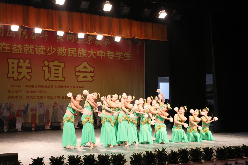 我校党委副书记汤放华和市人民政府副秘书长、市民宗局局长王国保分别代表承办单位和市委市政府致辞。半岛web版登录入口_半岛online(中国)《民族器乐大联奏》拉开了联谊会序幕。民族舞《缅桂花儿朵朵开》、诗朗诵《江格尔》、旗袍走秀、藏族舞《吉祥》、歌伴舞《扎西德勒》等13个节目精彩纷呈,高潮迭起。少数民族学生代表向与会嘉宾敬献哈达,大家互道“扎西德勒”。与会嘉宾为这四所大中专院校10名特困少数民族优秀学生代表发放了帮扶金。(文/图 文彦波)