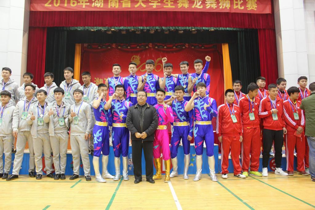 本次比赛由湖南省大学生体育协会主办,湖南网络工程职业学院承办,分为大学男子组、大学女子组、学院男子组、学院女子组、高职专科男子组、高职专科女子组六个组别,设立了规定套路、自选套路、竞速舞龙、障碍舞龙等舞龙类项目和规定北狮、自选北狮、竞速北狮、传统北狮等舞狮类项目,有来自湖南农业大学、湖南网络工程职业学院等11所高校的11支代表队参加了本次比赛。我校代表队在领队熊兴吾,教练员胡科、王高山的带领下参加了学院男子组的比赛,一举获得了规定套路、障碍舞龙两枚金牌。(郭羽)