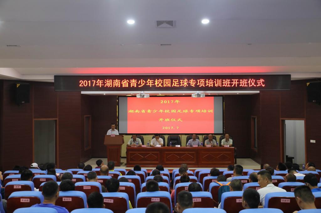 (本网讯)7月27日上午9:00,由湖南省青少年校园足球工作领导小组、省教育厅主办,我校承办的2017年省青少年校园足球中小学骨干体育教师培训在我校开班。副校长雷存喜、省青少年校园足球工作领导小组办公室专员王冬冬、益阳市教育局体卫艺科科长张伟、体育学院领导班子成员、本期培训班教师团队、班主任及工作人员等出席了开班仪式。