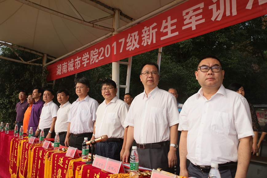 党委书记罗成翼在武装部部长龙文和军训总教官李波的陪同下,检阅了由2017级参训新生组成的方队。