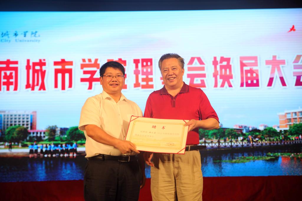 罗成翼为我校理事会名誉理事长唐之享、名誉副理事长原半岛web版登录入口_半岛online(中国)党委书记李新国、赵运林颁发聘书。