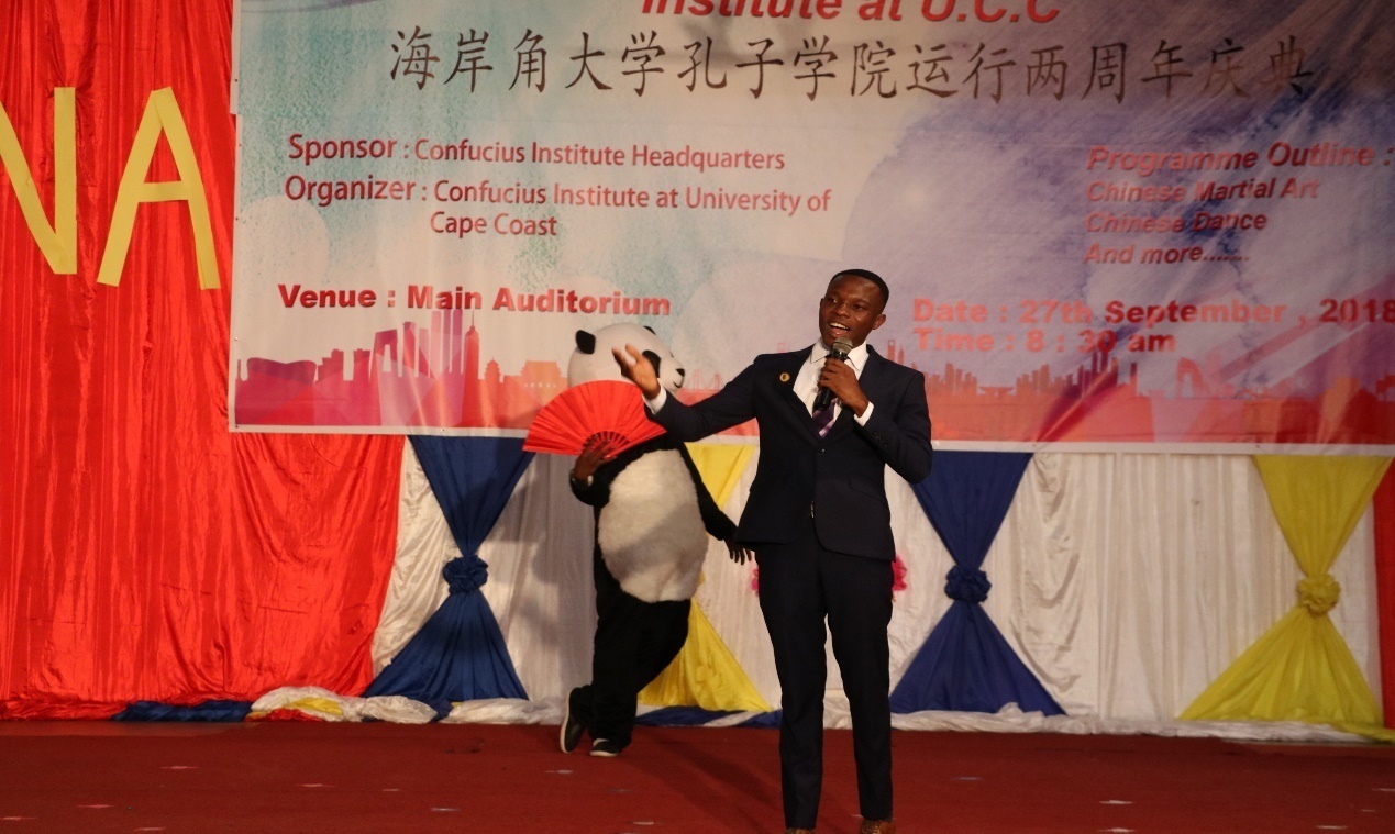 (本网讯)加纳当地时间9月27日上午,加纳海岸角大学孔子学院在大学大礼堂举行运行两周年庆典暨孔子学院日庆祝活动。加纳中部省省长夸美那.邓肯(Kwamena Duncan)、海岸角市酋长奥库阿曼赫尼.纳纳.库阿西.阿塔二世(Oguamanhene Nana Kwesi Ata 2)、海岸角大学校长代表农业与自然科学学院院长萨姆.阿穆教授(Prof. Sam Amoah)、海岸角大学人文法律学院院长朵若.安都.卜安朵教授(Prof.Dora Edu-Buandoh)、青建国际(加纳)发展有限公司总经理刘宗帅、科达(加纳)陶瓷厂有限公司总经理李伟、海岸角大学孔子学院外方院长伊斯梅尔.门萨教授(Prof.Ishmael Mensah)、海岸角大学孔子学院中方院长胡亮才教授等出席了庆典。中国驻加纳大使王世廷先生发来贺信。