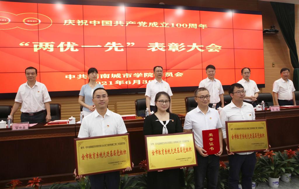 党委副书记何旭娟宣读了省、市和学校三级“两优一先”表彰决定。大会对6个获得全省高校党组织“对标争先”建设计划第二批项目单位及个人、12个获得益阳市委、市教育工委“两优一先”先进单位和个人、55个获得校级“两优一先”先进单位和个人进行了表彰。