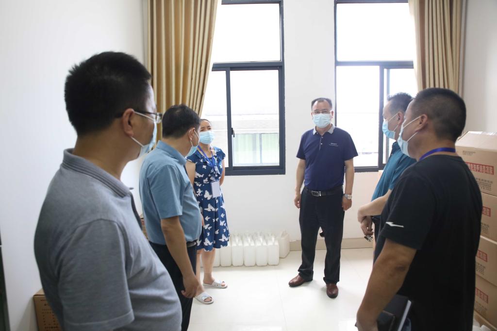 看望防控办工作人员并查看防疫物资储备。