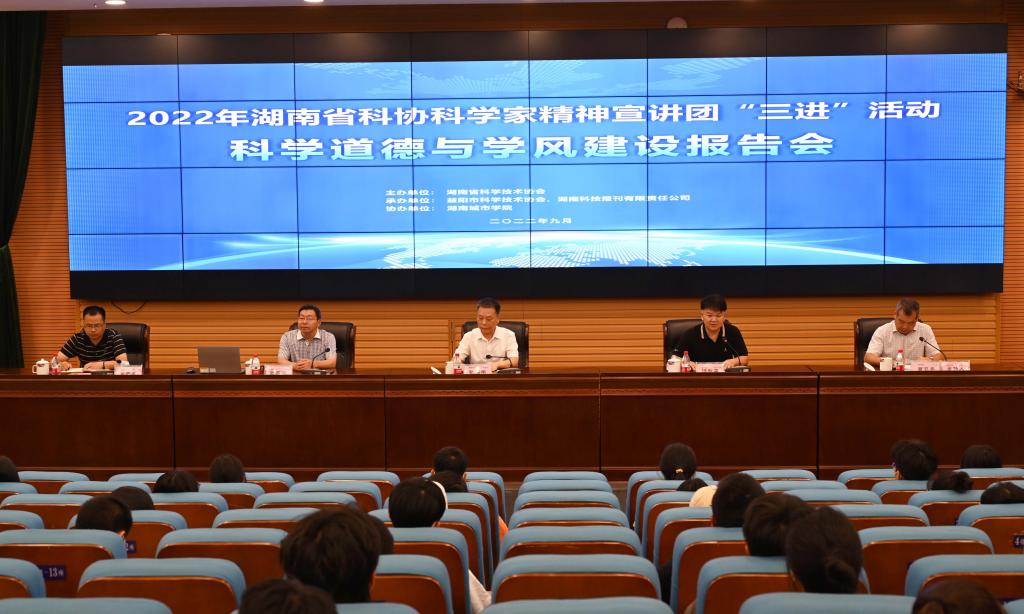 本网讯(通讯员 刘湛军)9月20日,2022年湖南省科协科学家精神宣讲团“三进”活动在我校图书馆报告厅举行。省科协党组成员、副主席张辉学,湖南师范大学教授、博士生导师匡乐满,校长汤放华,副校长袁志成出席,160余名师生参加。活动由益阳市科协党组书记、主席曹卫兵主持。