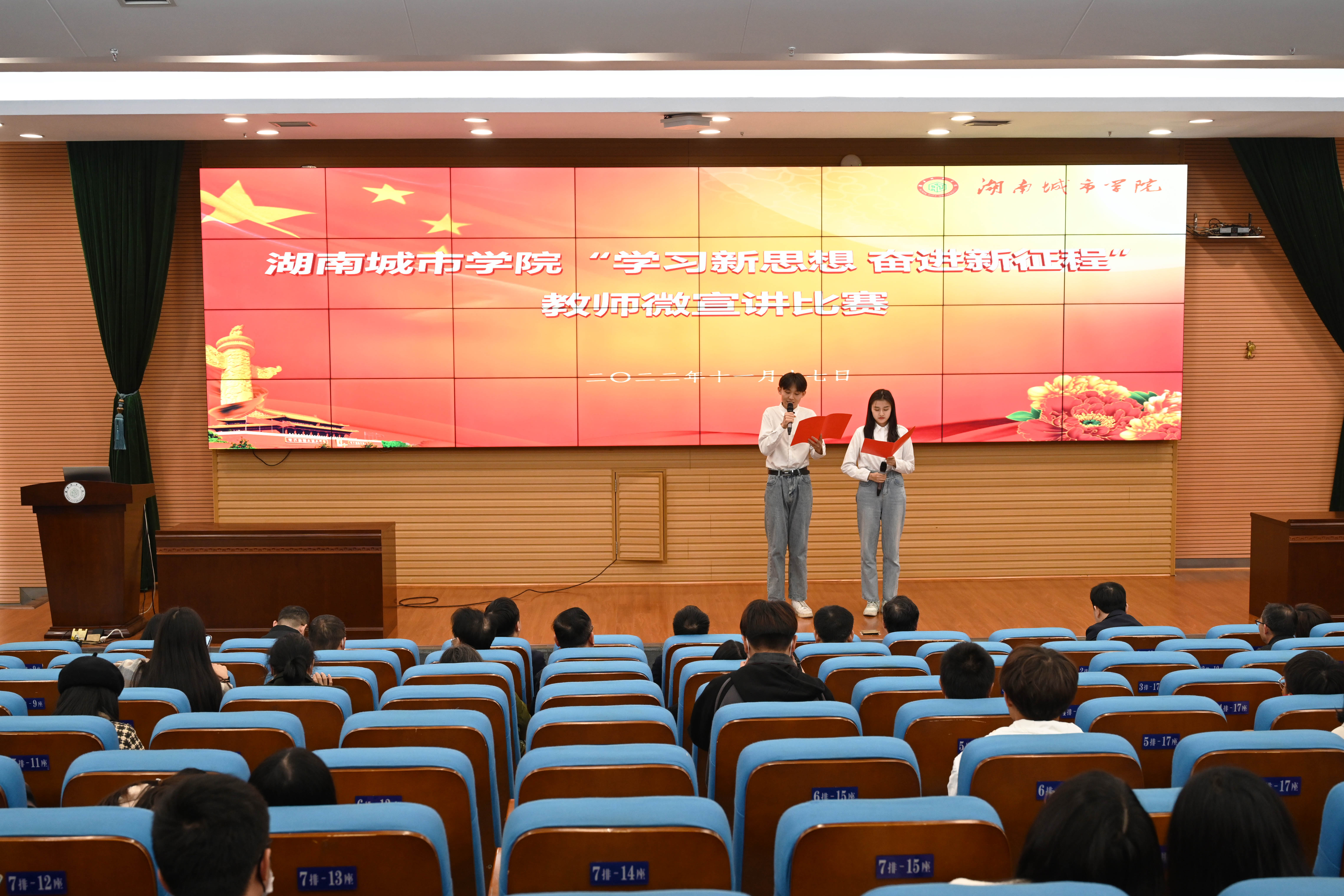 本网讯(通讯员 周文娟)“党的二十大开启了以中国式现代化全面推进中华民族伟大复兴的新征程,中国式的现代化需要现代化的人才做支撑……” 11月17日,半岛web版登录入口_半岛online(中国)“学习新思想,奋进新征程”教师微宣讲比赛在图书馆报告厅举行。来自各二级单位的18位参赛选手们围绕党的二十大报告,从党的二十大的历史地位与重大意义、党的二十大精神等方面,用“小故事”诠释“大道理”,将党的创新理论送到师生的心坎上。党委副书记何旭娟,副校长袁志成,党委委员、组织部部长吕贤军出席。