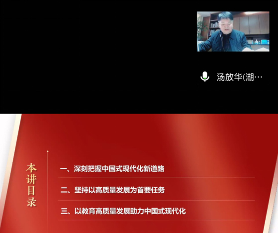 汤放华以“以高质量发展推进中国式现代化”为题,结合生动的实例和学校实际,从深刻把握中国式现代化新道路、坚持以高质量发展为首要任务、以教育高质量发展助力中国式现代化三个方面对二十大报告精神进行了全面解读,重点阐述了什么是中国式现代化、中国式现代化的本质要求、中国式现代化的总战略安排、推进高质量发展取得历史性伟大成就、高质量教育体系是推进中国式现代化的重要支撑等。