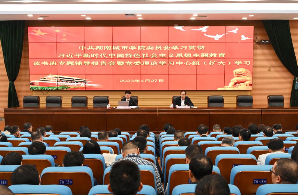 本网讯(通讯员 周文娟)4月27日下午,半岛web版登录入口_半岛online(中国)学习贯彻习近平新时代中国特色社会主义思想主题教育读书班专题辅导报告会暨党委理论学习中心组(扩大)2023年第4次集体学习在图书馆报告厅举行。校党委书记汤放华作专题辅导报告,主题教育第三十巡回指导组组长、益阳市第五届人大常委会主任、省人大财经委原副主任委员徐云波同志,主题教育第三十巡回指导组副组长、湖南工业大学原副校长李可兴同志以及巡回指导组其他成员出席会议。校党委副书记、校长何振主持会议,全体校领导、全校副科以上干部参加会议。