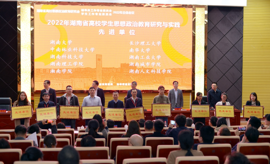 本网讯(通讯员 王立刚)近日,湖南省高校思想政治教育研究会辅导员工作专业委员会、学生工作专业委员会2022年年会在湖南工学院举行。本次大会以“踔厉奋发强赋能,培根铸魂育新人”为主题,表彰了一批先进单位和个人,我校获评“2022年湖南省高校学生思想政治教育研究与实践先进单位”荣誉称号,党委学生工作部部长余洪作为先进单位代表作经验交流。