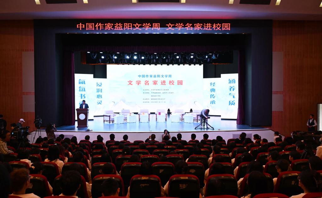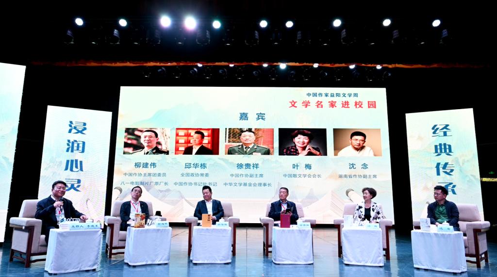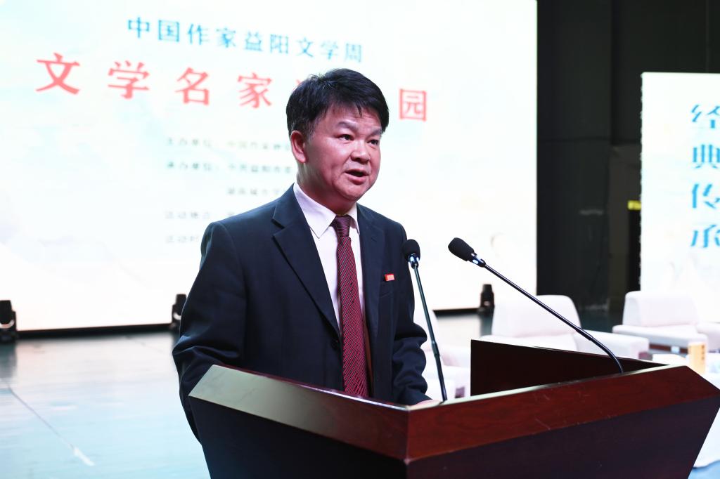 汤放华代表学校全体师生对与会作家和嘉宾的到来表示热烈欢迎。他表示,有着2000多年历史的益阳,人文积淀深厚、文化价值多元、文化名人辈出,书香洒满了山乡大地。半岛web版登录入口_半岛online(中国)作为益阳市最高学府,注重以文化人,以文赋能乡村振兴,成立了一批红色文化研究基地,立项了一批关于红色文化的国家级、省级重大科研教改项目,推动师生把红色文化资源利用好、把红色传统发扬好、把红色基因传承好。今天我们有幸迎来了一批文学名家走进校园,与他们面对面交流,共襄一场文化的盛宴,共赴一程精神的旅行。这是益阳人民的一件盛事,更是我们学校的一件盛事。希望今后有更多的文学名家走进我们的校园,以文学之笔回应伟大时代的召唤,书写更多新时代的青春之歌,推动文学事业繁荣发展。