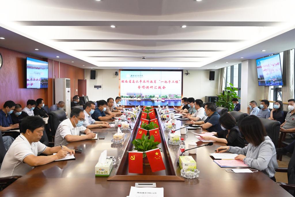 本网讯(通讯员 向博毅)5月31日,湖南省高水平本科教育“一把手工程”专项调研专家组一行来我校调研,学校在一办公楼一会议室召开工作汇报会。专家组组长、吉首大学副校长冷志明和专家组成员,校党委书记汤放华,校长何振,副校长雷存喜出席,相关职能部门主要负责人和二级学院院长参加。会议由何振主持。