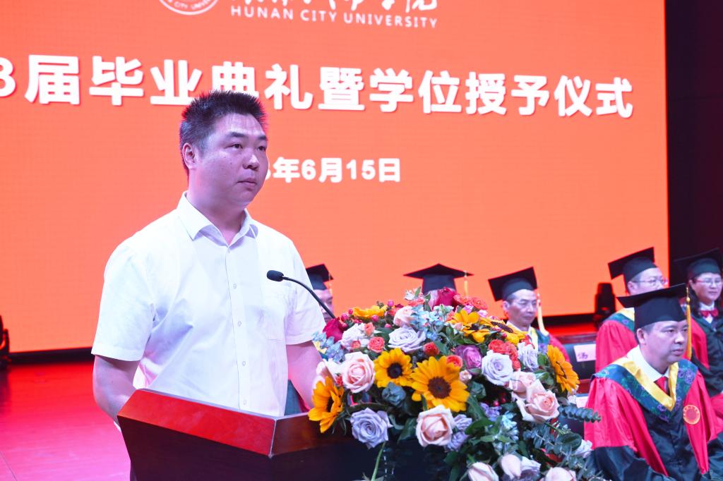 毕业生代表、湖南省优秀学生党员、土木工程学院杨润益回忆了他懵懂青涩、滚烫沸腾的青春和成长故事,对母校的悉心栽培和关爱表达感激,表示将用青春的智慧和汗水,谱写新时代城院学子璀璨的青春华章,在社会的各行各业中尽情施展才华,让青春在全面建设社会主义现代化国家的火热实践中绽放绚丽之花。