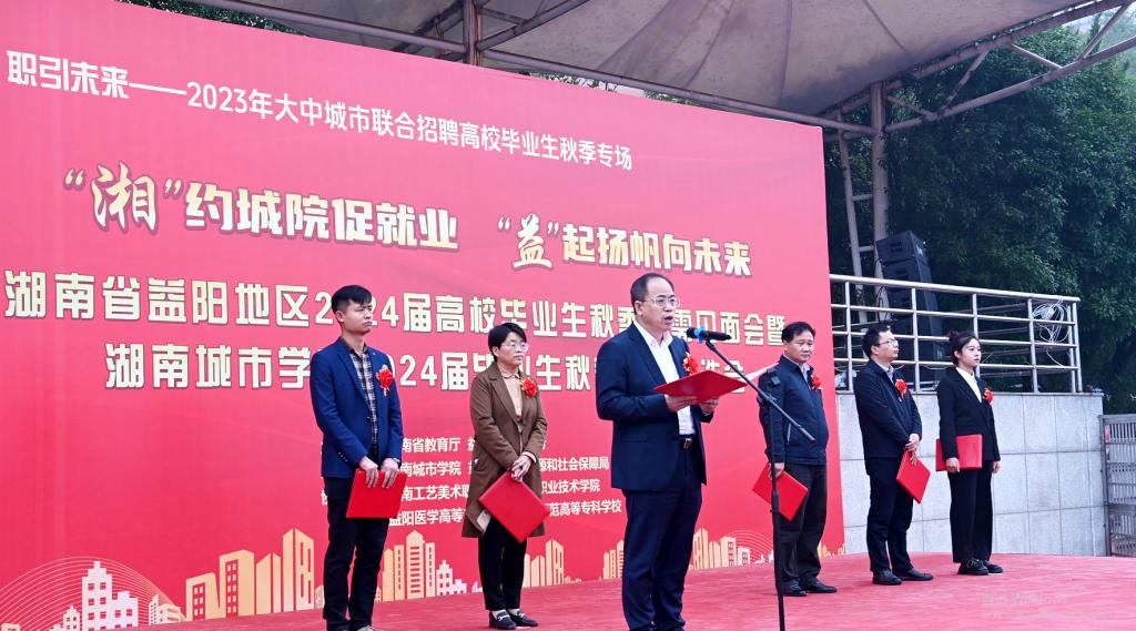 开幕式由副校长袁志成主持。校长何振致辞欢迎,他代表学校向莅临本届双选会的领导嘉宾表示诚挚欢迎和衷心感谢,并介绍了学校的就业基本情况。他表示,此次综合双选会,是深入学习贯彻党的二十大精神,积极推进就业创业“一把手工程”的有力举措。希望各位毕业班同学认清形势、转变观念、调整心态、把握机遇,加倍珍惜招聘单位提供的就业机会。学校将加大投入,努力把益阳片区市场建设成为学生就业创业的可靠平台,积极带动益阳地区高校毕业生高质量充分就业。