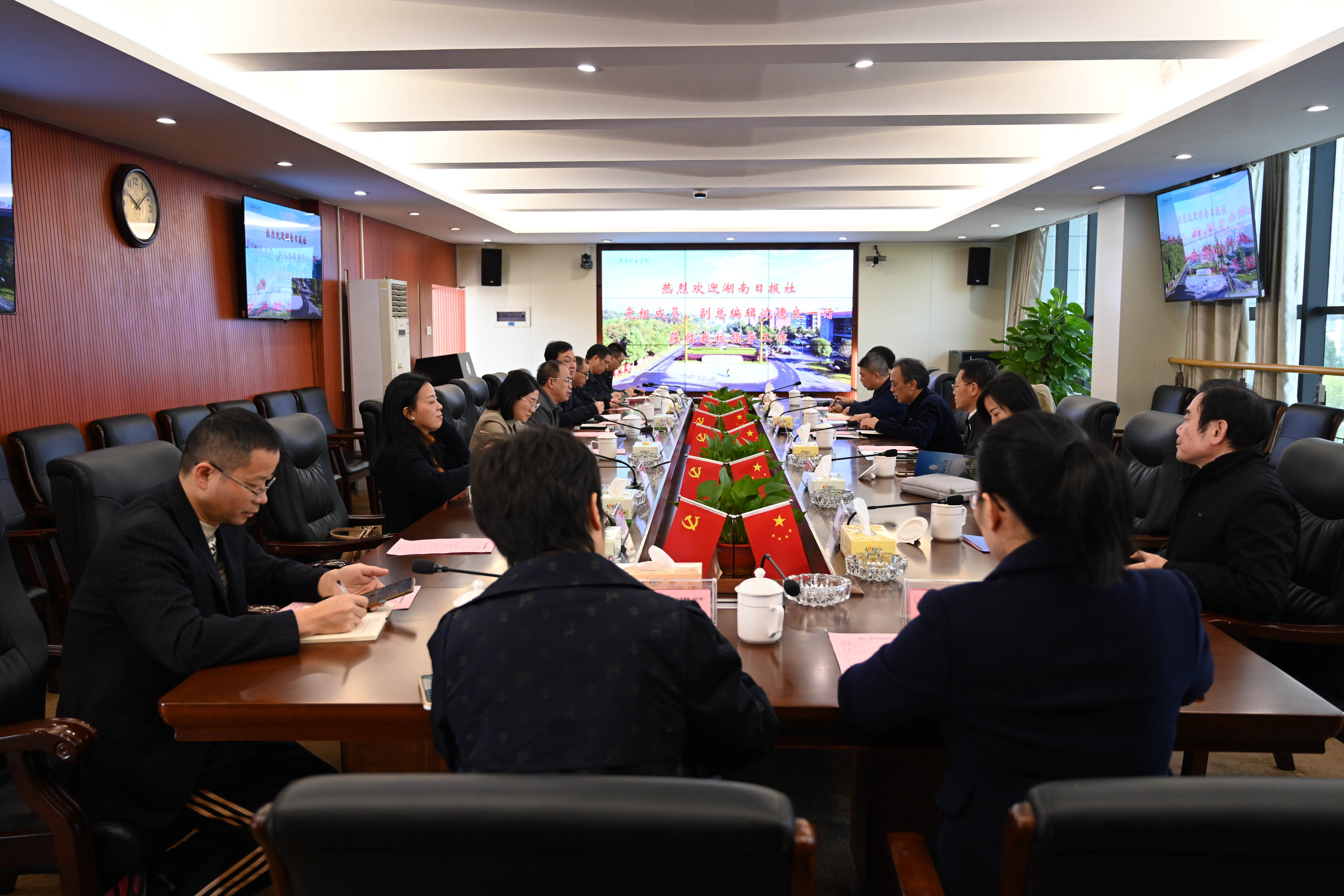 本网讯(通讯员 蔡润晨)11月16日上午,湖南日报社党组成员、副总编辑沈德良率队来校开展宣传思想工作调研,并在办公楼一会议室召开座谈会。校长何振主持会议并致欢迎词。