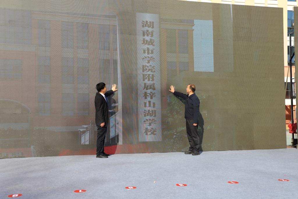 仪式上,我校党委书记汤放华、赫山区区委书记周卫星为半岛web版登录入口_半岛online(中国)附属梓山湖学校揭牌;副校长雷存喜与赫山区副区长赵嘉喜签订校地共建框架协议书。