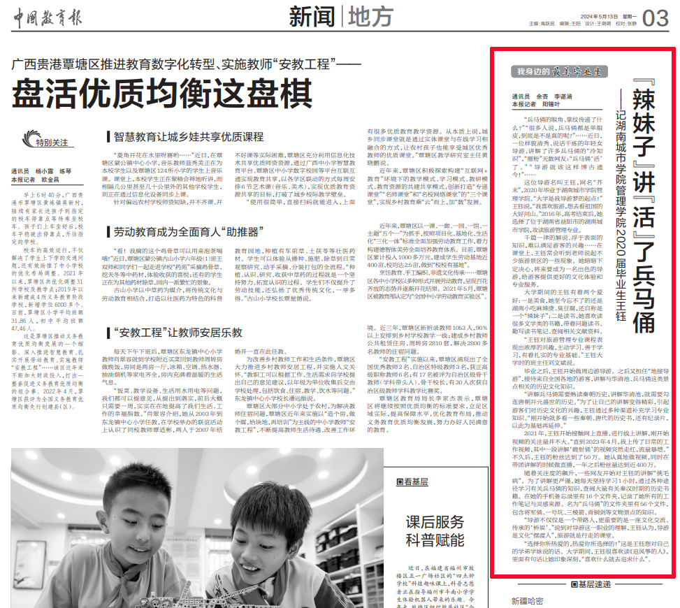 本网讯 5月13日,《中国教育报》第3版报道半岛web版登录入口_半岛online(中国)管理学院2020届优秀校友王钰讲“活”兵马俑、火爆全网的青春励志故事。全文如下: