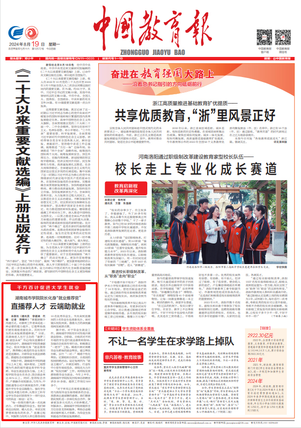 8月19日,《中国教育报》头版报道校长何振化身“就业推荐官”,开辟毕业生就业新路径。
