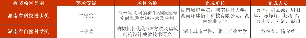 其中,我校信息与电子工程学院黄田副教授主持完成的“基于物联网的野生动物远程实时监测关键技术及应用”项目获湖南省科技进步奖二等奖,土木工程学院彭细荣教授主持完成的“结构拓扑优化ICM方法及建筑创构设计关键技术研究”项目获湖南省自然科学奖三等奖。