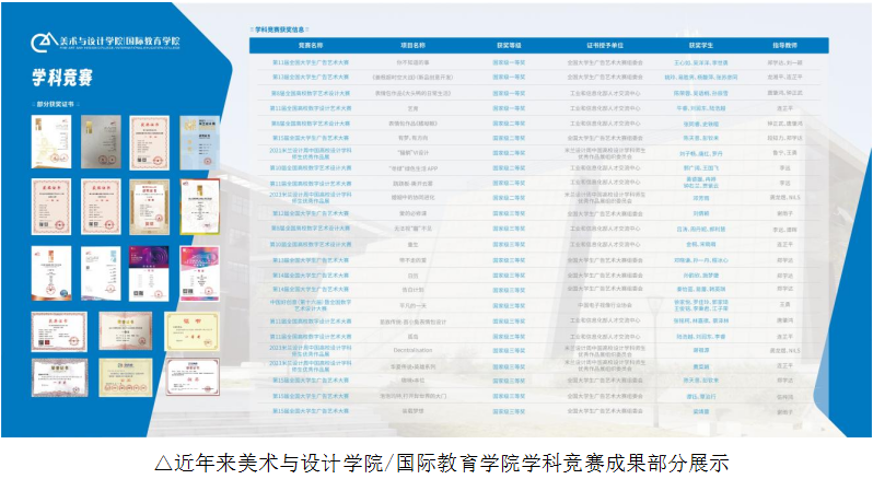 在学院老师们的悉心指导与身先示范下,学生们刻苦求学、积极磨炼专业技能,呈现出青蓝相继的喜人局面。近五年来,学生积极参加学科竞赛,参加全国、省、市各级各类展览、竞赛及大学生创新创业活动,如大学生广告艺术大赛、公益广告艺术大赛、全国高校数字艺术设计大赛、米兰设计周等项目;国家级行业赛主要集中在中国创意包装大赛、中国大学生广告艺术节学院奖、金犊奖等项目。五年累计获奖项目为:国家级竞赛获奖49项,省级竞赛获奖283项,国家行业类竞赛获奖249项,共计获奖581项,在校生的获奖率达到40%。总的来说,学院为在校生积极参与各项学科竞赛项目,提供了良好的竞赛氛围。