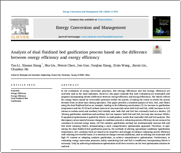 李涛的论文题目为“Analysis of dual fluidized bed gasification process based on the difference between energy efficiency and exergy efficiency”。在导师向夏楠指导下,李涛在研究中发现,在目前能源转化过程的评估中,热效率(EnE)和㶲效率(ExE)作为主要指标的评估方法并不完善,应当引入DEnEx(热㶲效率差值)。DEnEx反映了能源转化系统中不可逆过程引起的损失,揭示了系统在运行过程中偏离理想状态的程度。本文以双流化床为例,详细分析了EnE、ExE和DEnEx,指出仅改变内部条件无法实现能源转化过程的最优化,必须引入外部条件,如采用高固定碳的原材料、采用催化气化方法才能实现能源转化过程的最优化。另外,将DEnEx引入其他能源系统,如联合热电系统、燃料电池和光伏系统,可以为这些能源系统提供更全面的性能评估方法,推动各种能源转化技术发展。