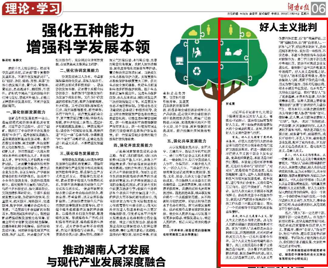 (本网讯)7月14日,《湖南日报》06版刊发我校党委书记罗成翼撰写的文章,题为《好人主义批判》。全文如下: