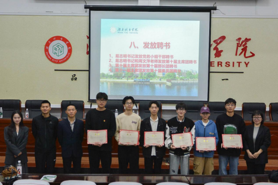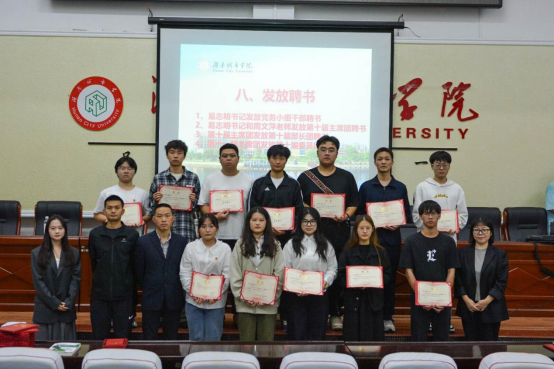 最后本届团委副书记邓馨婷宣读优秀部长、优秀委员名单。并由易志明书记、周文萍老师、学工办全体老师为党务小组干部、第十届部长团、第十届委员团颁发聘书及优秀委员荣誉证书。