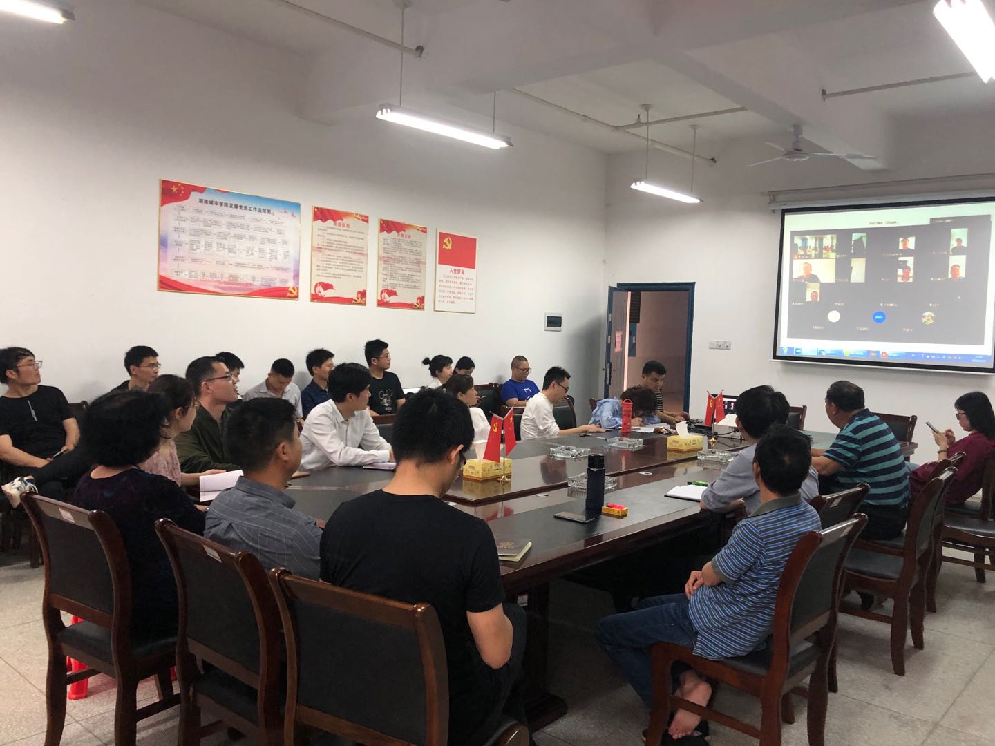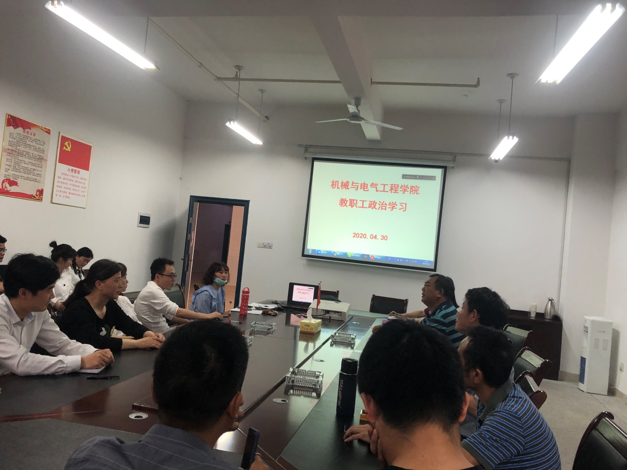 进一步贯彻传达半岛web版登录入口_半岛online(中国)四届五次教职工、工会会员代表大会成果和精神,2020年4月30日下午,机械与电气工程学院在会议室召开了全院教职工政治学习。由于疫情的影响,本次政治学习采取现场学习与线上会议相结合的形式举行,会议由党总支书记徐畅贤主持。