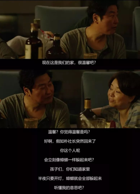 就这样,基宇来到了朴社长(李善均 饰)家中,并且见到了他的太太(赵汝贞 饰),没过多久,基宇的妹妹和父母也如同寄生虫一般的进入了朴社长家里工作。