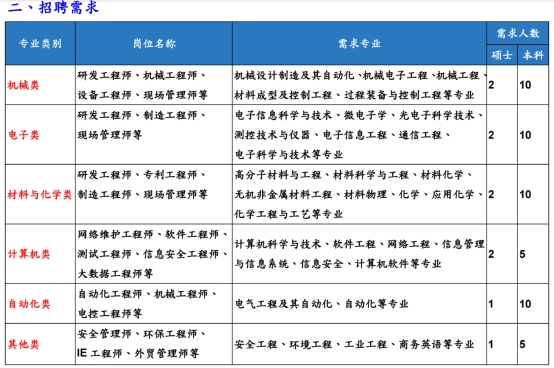 需求专业:【本科】化学工程与工艺、商务英语、复合材料与工程、智能制造工程、机械电子工程、机械设计制造及其自动化、物理学、物联网工程、电子信息工程、电气工程及其自动化、英语、通信工程、高分子材料与工程